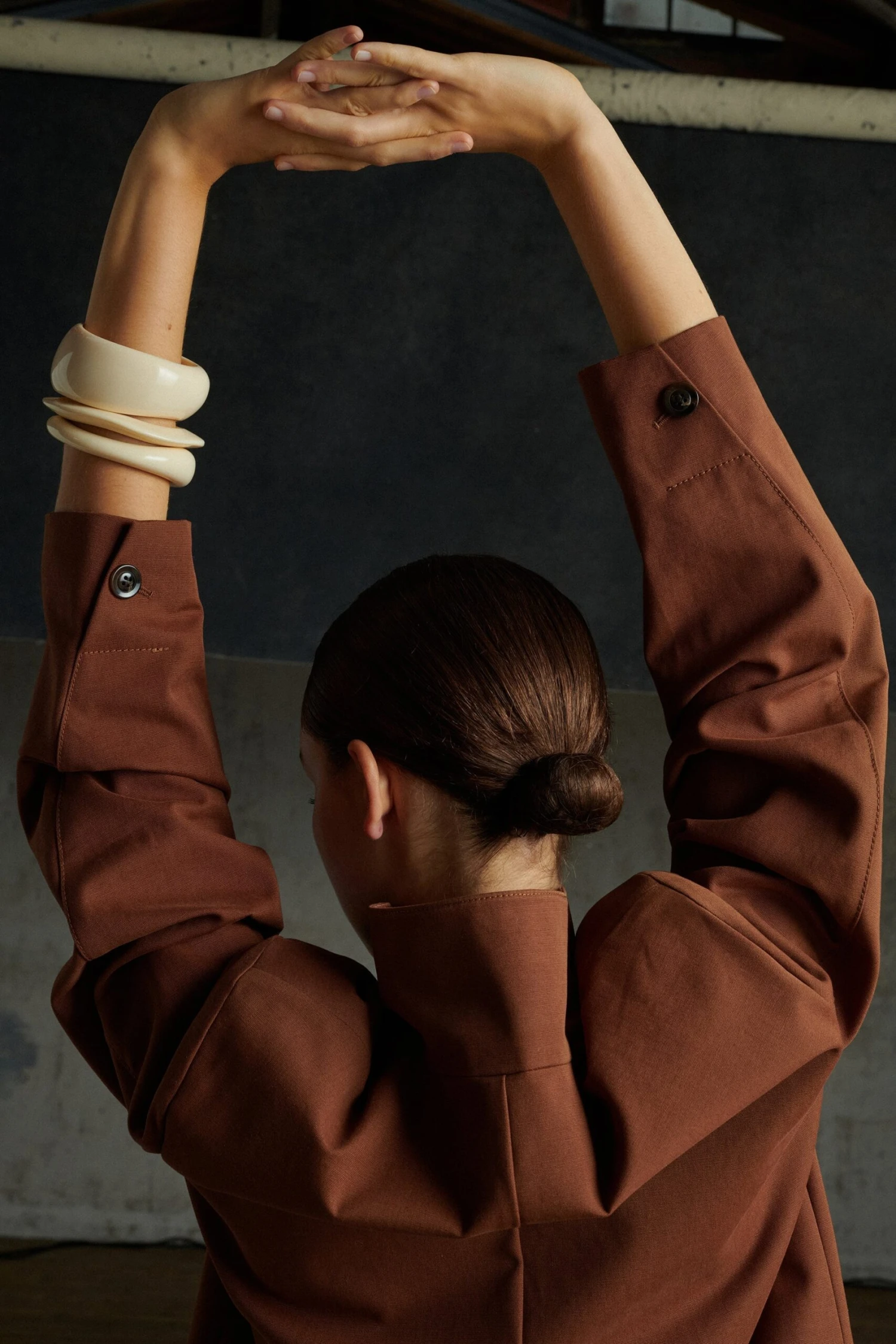 Ce bracelet en résine pare l’avant-bras et donne du caractère à un top retroussé sur les manches.