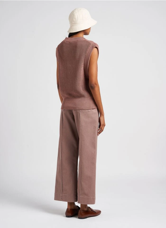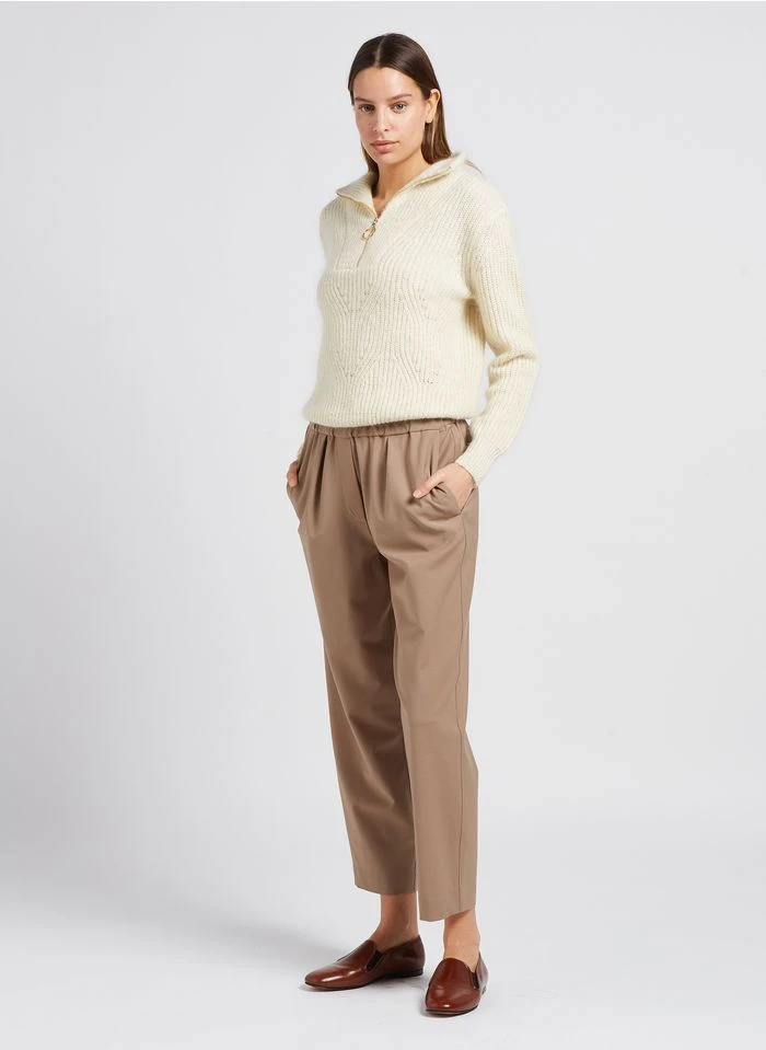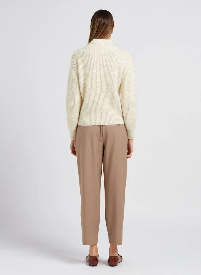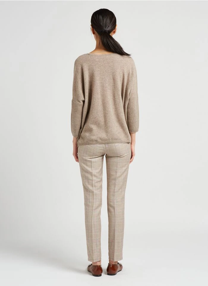 Ce modèle est présenté avec – Col V – Manches longues – Emmanchures basses – Coupe ample – Finitions bord-côtes – 100 cachemire by PABLO, Pantalon droit à rayures en coton mélangé by REIKO