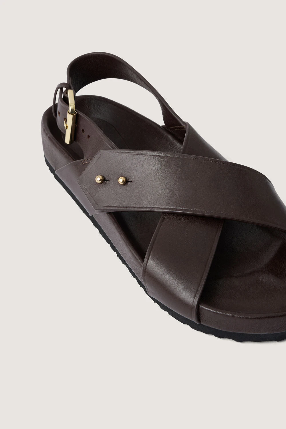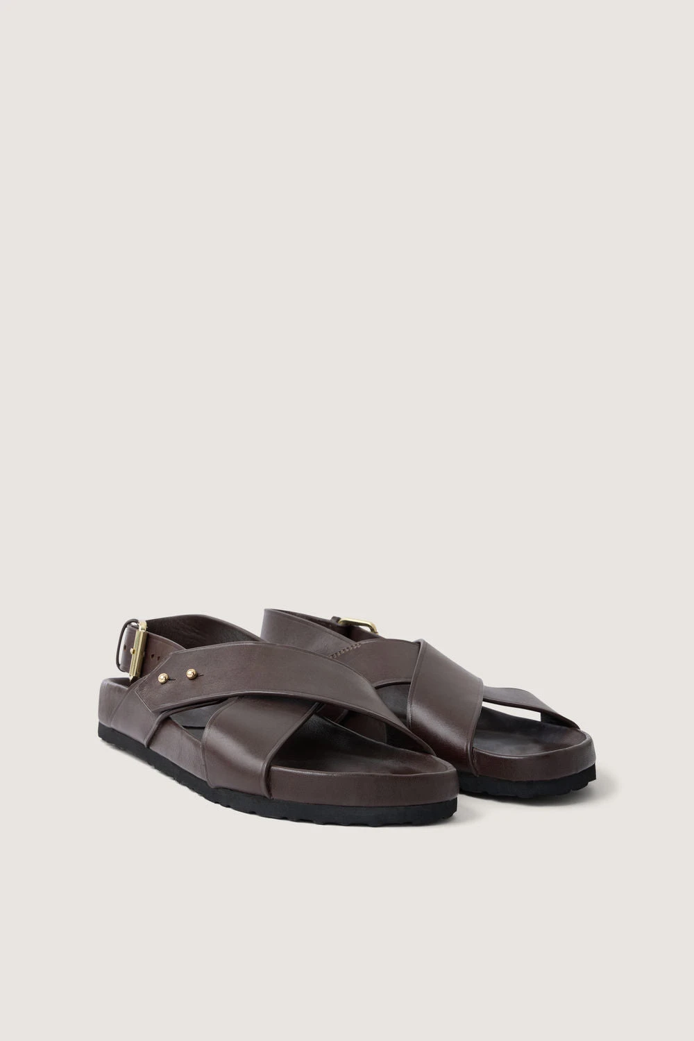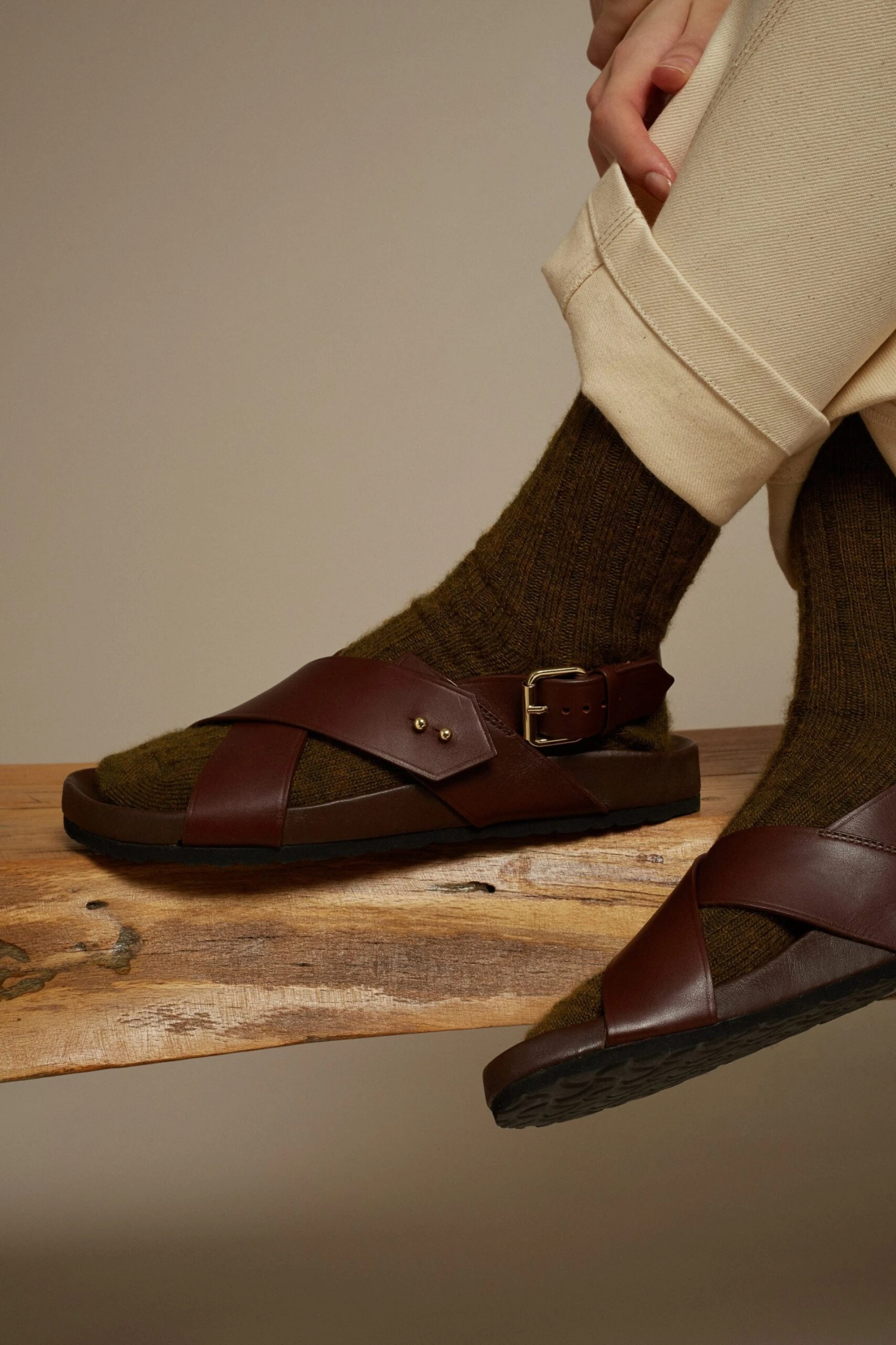OLAF est une sandale en cuir. Sa semelle épaisse (en liège recouvert de cuir lisse) épouse la courbe du pieds pour pouvoir les porter avec confort toute la journée. Les brides croisées apportent de la tenue. Ce soulier taille une demi-pointure au-dessus pour pouvoir y glisser des chaussettes épaisses afin de traverser la saison.