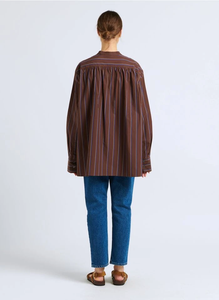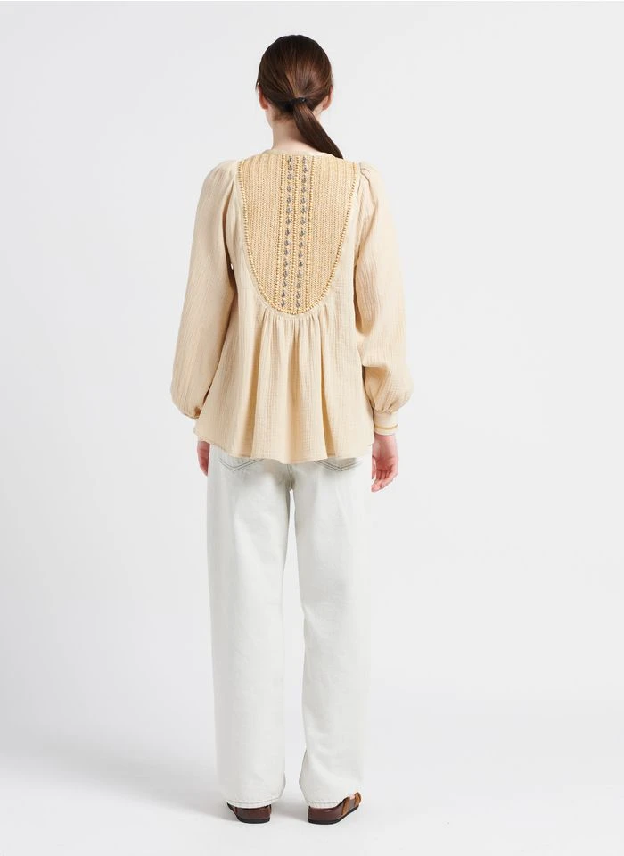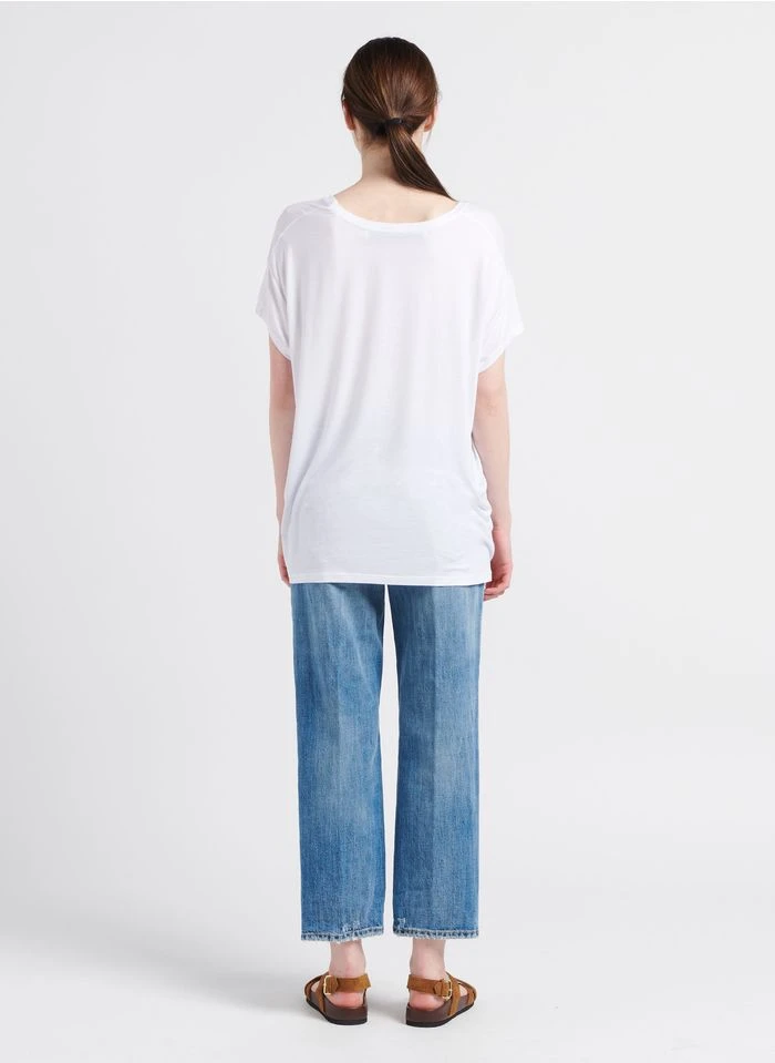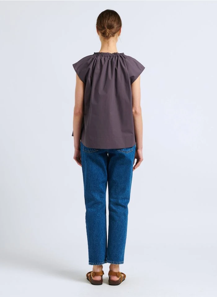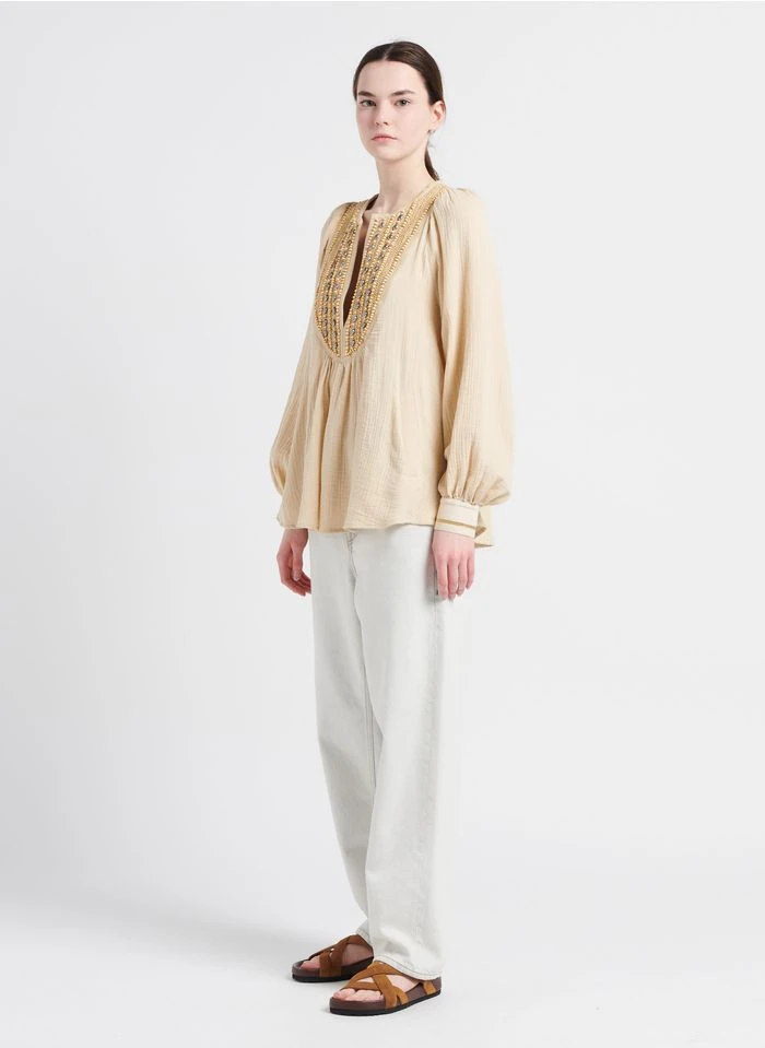 Ce modèle est présenté avec Top col tunisien en coton mélangé by MES DEMOISELLES, Jean droit en coton délavé by AMERICAN VINTAGE